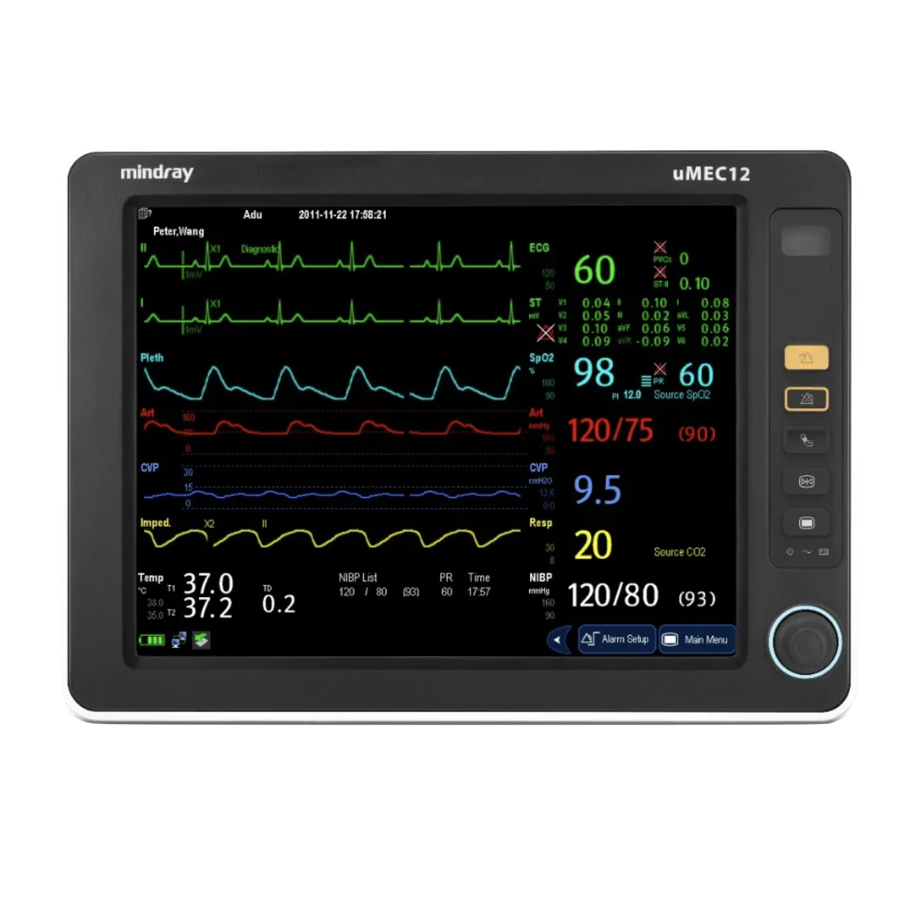 - ECG (electrocardiograma): frecuencia y ritmo cardíaco. - SpO₂ (saturación de oxígeno): mediante sensor de oximetría. - NIBP (presión arterial no invasiva): sistólica, diastólica y media. - Temperatura corporal: uno o dos canales de medición. - Frecuencia respiratoria: por impedancia o sensor específico. - EtCO₂ (capnografía): útil en anestesia o pacientes ventilados. - IBP (presión invasiva): para UCI o quirófano. - CO (gasto cardíaco): en monitores avanzados. |